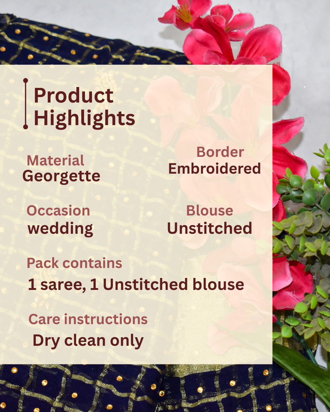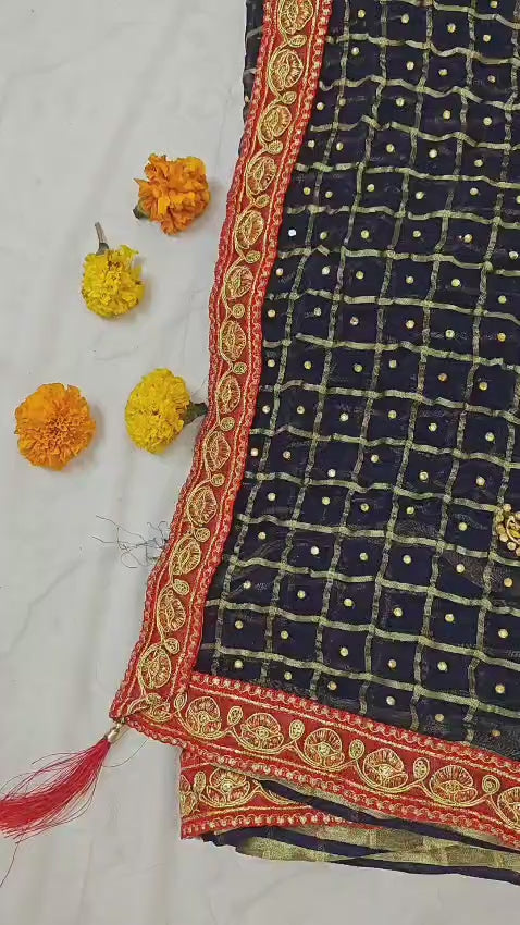 Crafted in soft crushed georgette, this navy blue bandhani saree features delicate golden motifs and a striking red zari border. Lightweight yet elegant, it’s a perfect blend of traditional artistry and effortless grace — ideal for festive and cultural occasions.