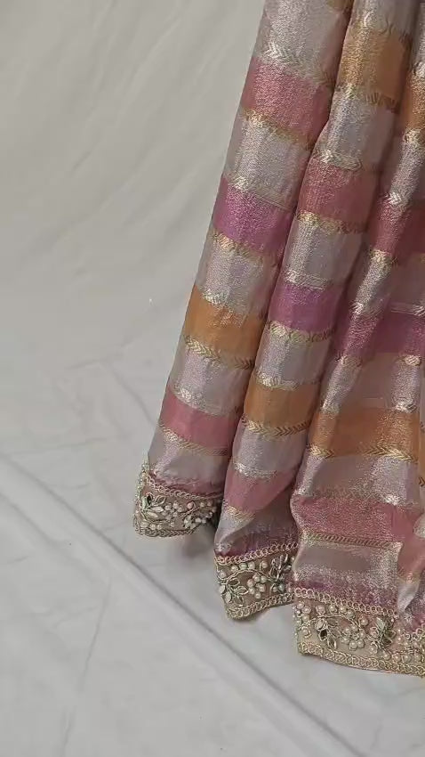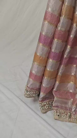ORGANZA STRIPED SAREE IN PURPLE, LAVENDER, PINK, PEACH & GOLD WITH EMBELLISHED BORDER.