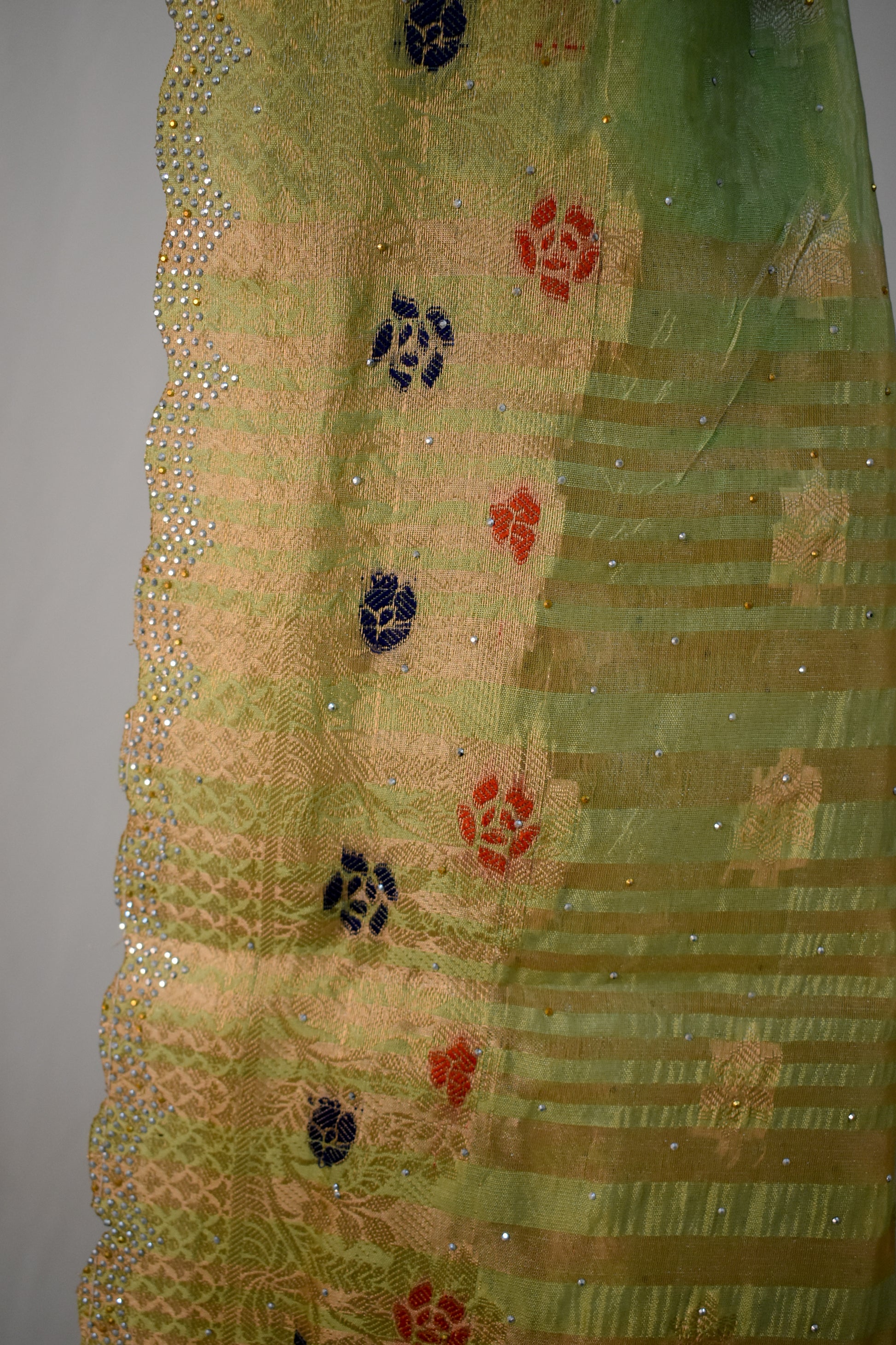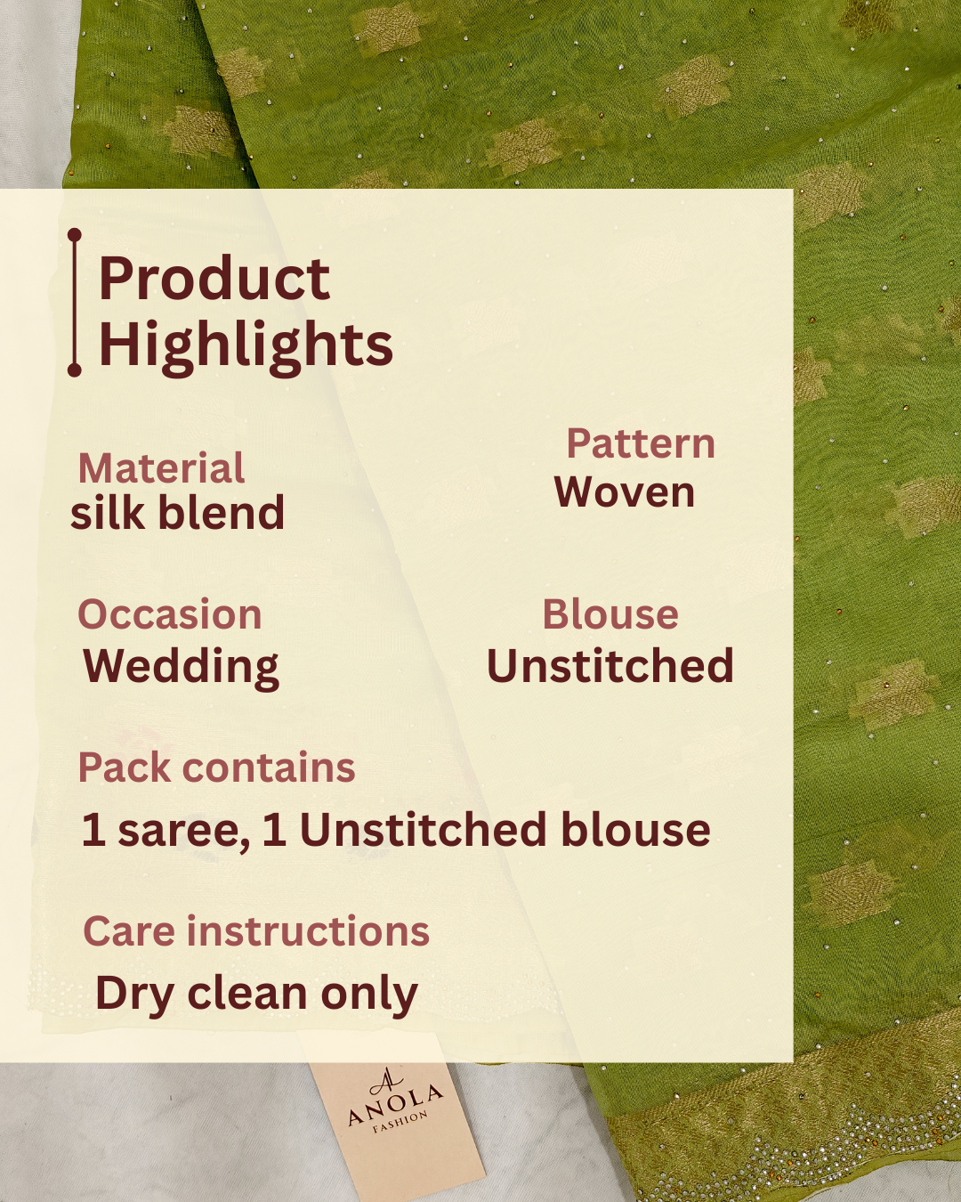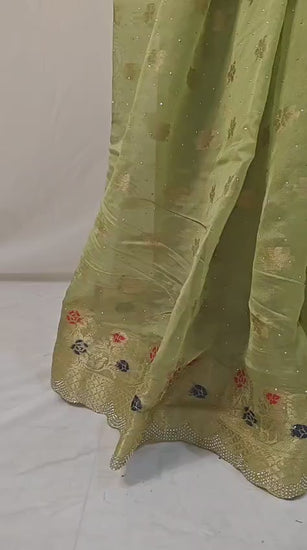 PARROT GREEN SILK BLEND SAREE WITH ZARI FLORAL BORDER & SWAROVSKI DETAILING.