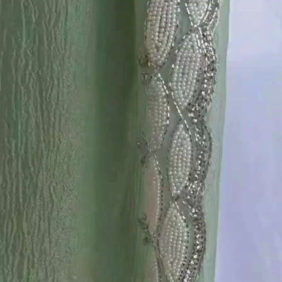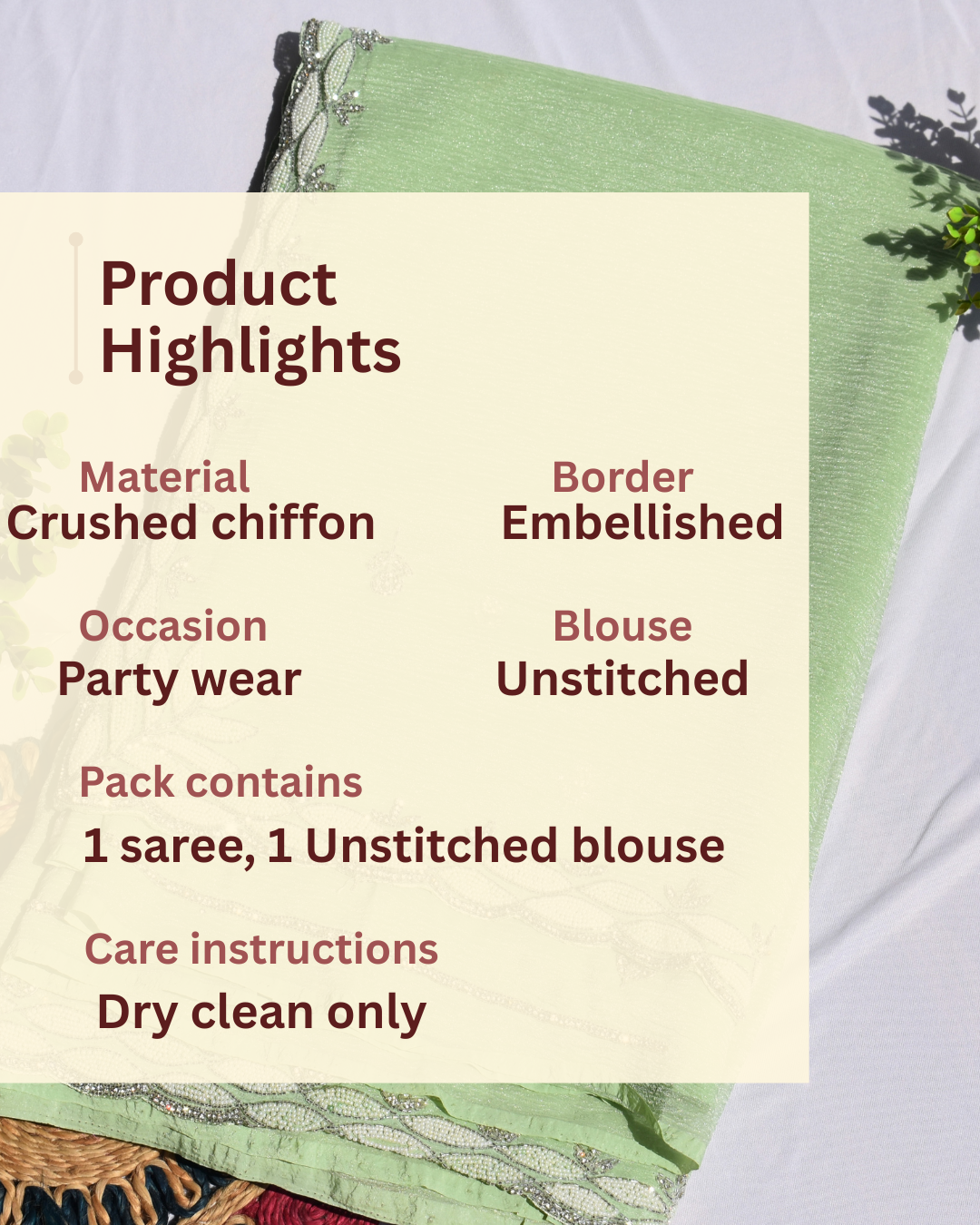 PASTEL MINT GREEN CRUSHED CHIFFON SAREE WITH INTRICATE EMBROIDERY BORDER.
