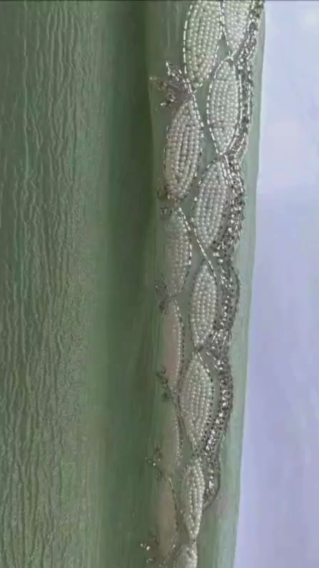 The delicate texture of the crushed chiffon gives the saree a graceful fall, while maintaining a lightweight and breathable feel, ideal for festive seasons, weddings, or formal gatherings. The highlight of this saree lies in its intricately embroidered border—adorned with fine silver threadwork, sequins, and bead detailing, creating a beautiful leaf and vine motif that adds an ethereal touch of elegance.