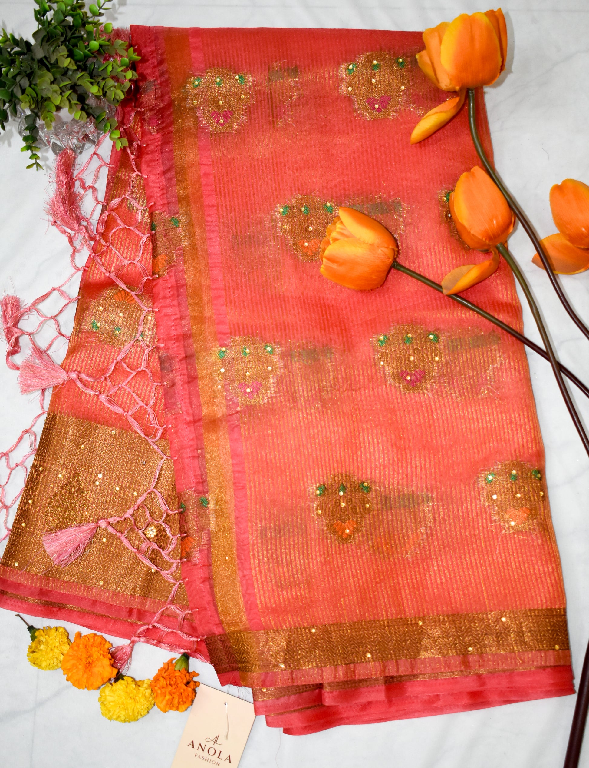 CRIMSON PINK ORGANZA SILK SAREE WITH ZARI WEAVE & BEAD DETAILING.