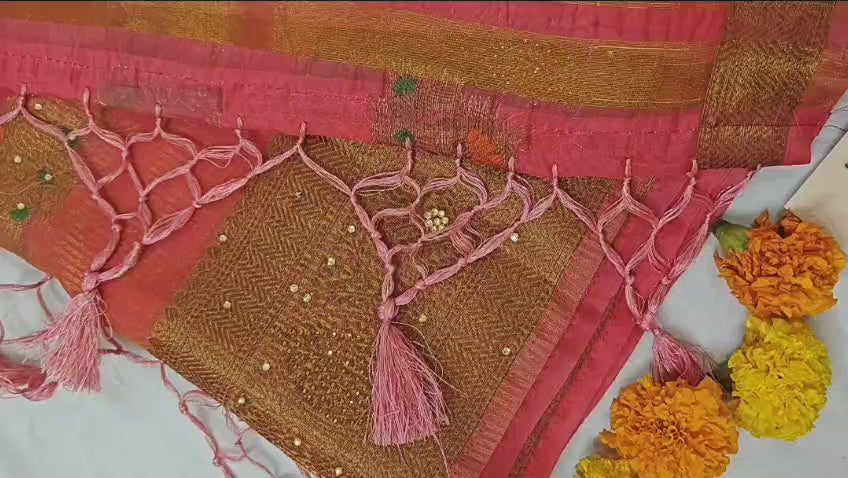 Elevate your ethnic charm with this Crimson Pink Organza silk Saree, beautifully crafted with sheen and delicate zari weave and subtle bead embellishments that add a hint of shimmer. The lightweight organza silk fabric drapes gracefully, making it perfect for festive occasions and celebrations. Finished with elegant tassel detailing on the pallu, this saree blends traditional artistry with timeless sophistication.