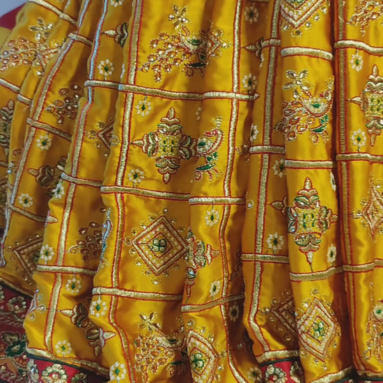 Elegant mustard yellow satin silk saree with a striking red border, adorned with traditional motifs and intricate detailing. Crafted from soft and lightweight satin silk, this saree drapes beautifully and adds a timeless charm.